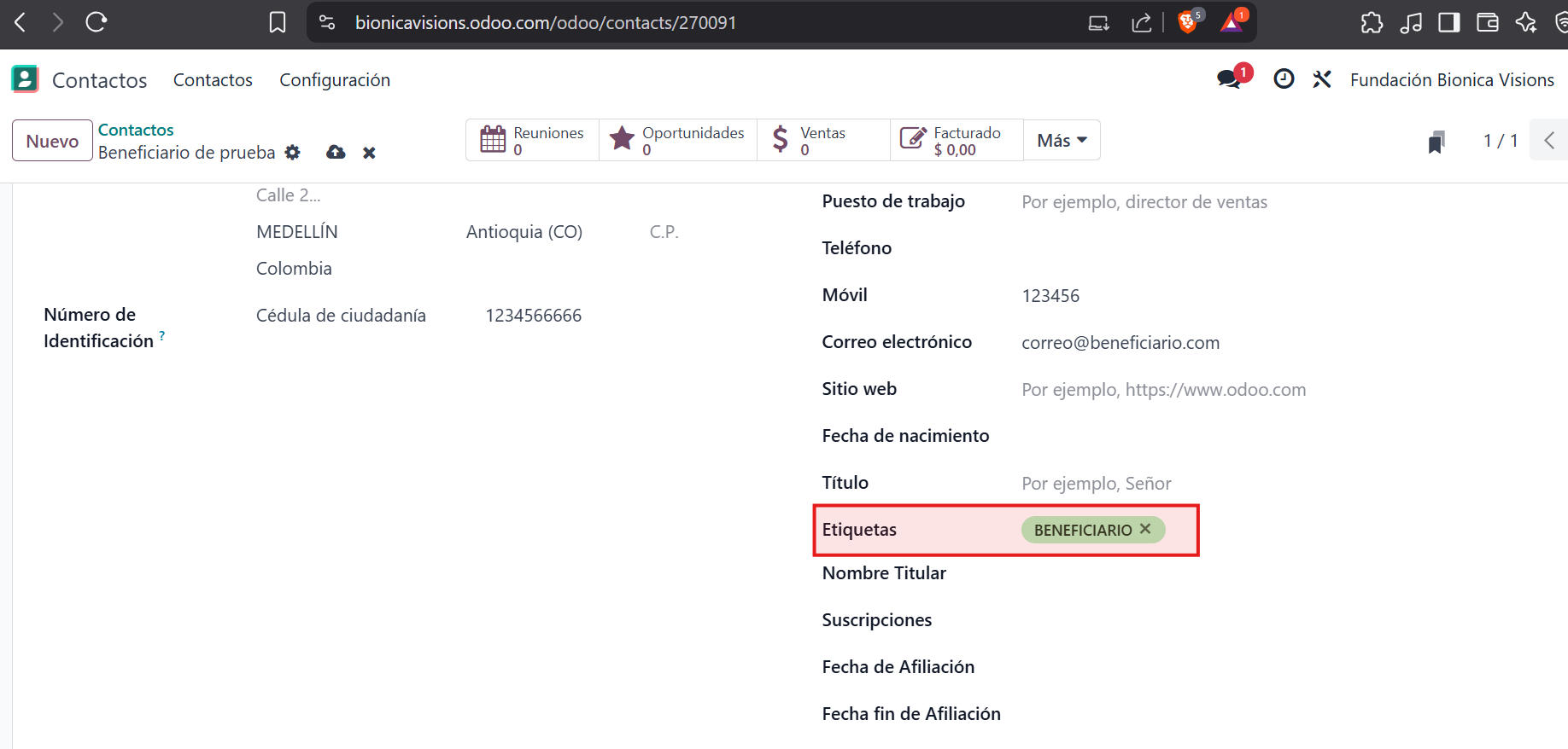 - Para asegurar la correcta clasificaci贸n del contacto beneficiario ya creado, es fundamental asignarle la etiqueta correspondiente. En el campo de Etiquetas del perfil, seleccione (o escriba para buscar) y aplique la etiqueta 'BENEFICIARIO'.